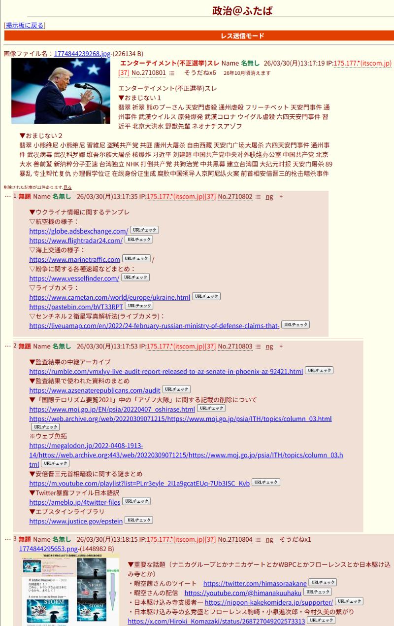 | … | 141無念Nameとしあき26/04/06(月)20:29:00No.1399054915そうだねx4>>アカの仕掛けたネットプロパガンダに見事にハマってるのがトランプ信者 |