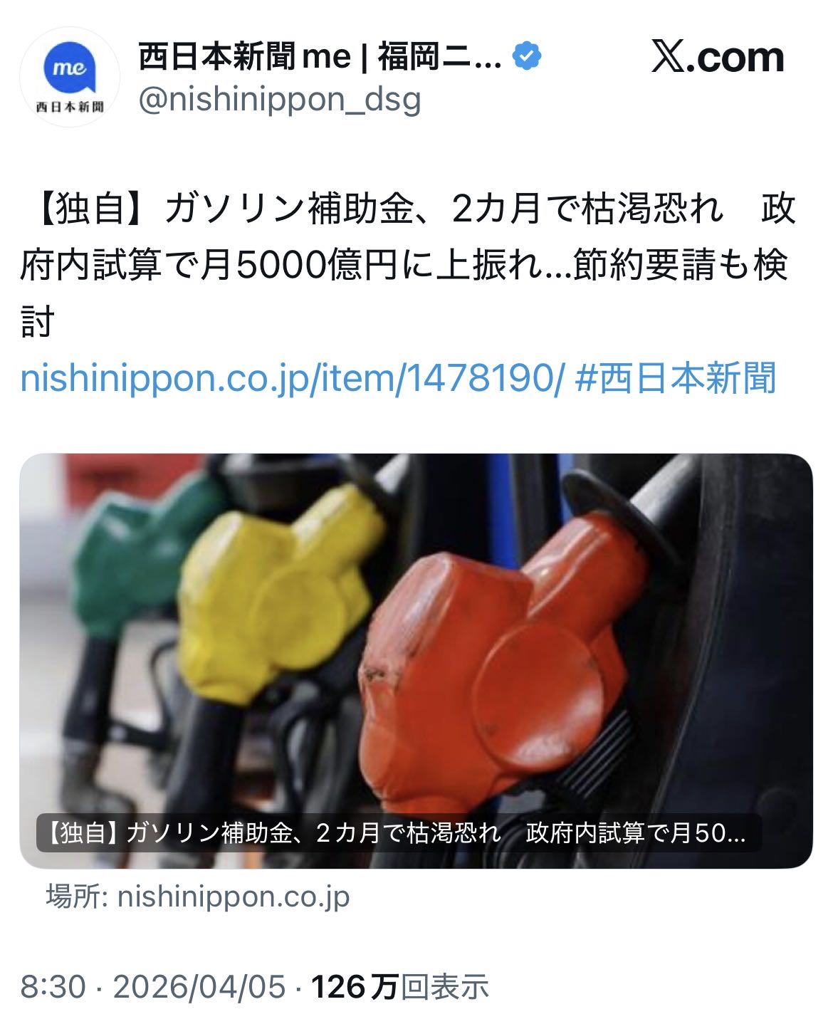 | … | 93無念Nameとしあき26/04/06(月)20:05:44No.1399048504そうだねx5 1775473544101.jpg-(155058 B) >リッター40円のガソリン補助金とかアホかと |