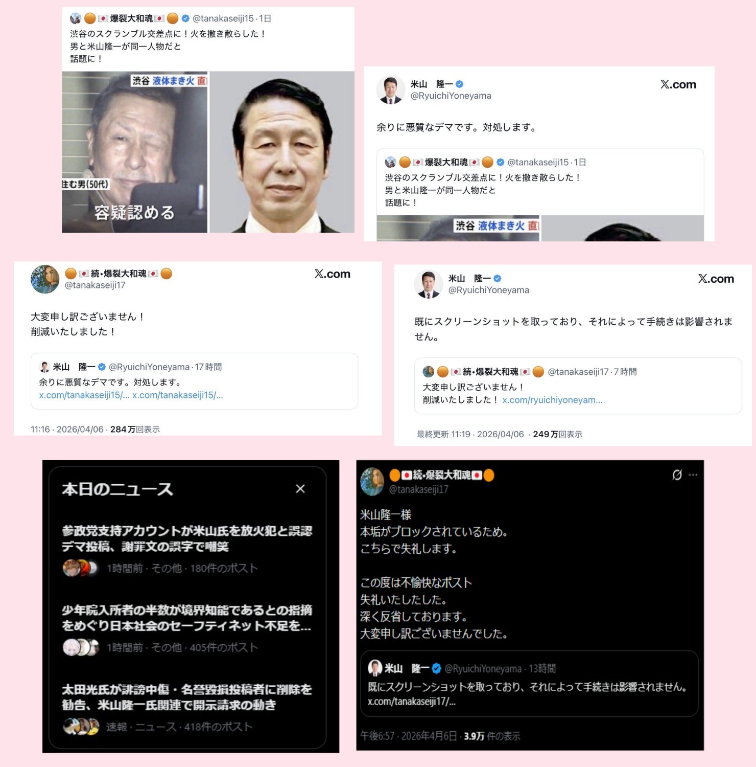 ※スクランブル交差点にガソリンまいた犯人(参政党支持者)が米山と同一人物だとデマポストをしたアカウント(参政党支持者)が謝罪したけれどよねちゃんが許さないって言ってる物語