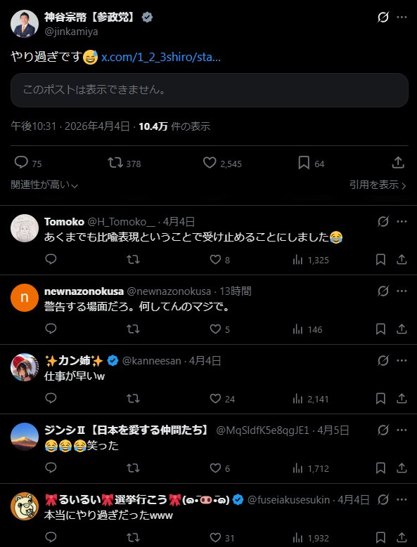 | … | 18無念Nameとしあき26/04/07(火)00:53:39 ID:UspYzRewNo.1399117768そうだねx2参政はそろそろ支持者の入れ替えをしないと⋯ |