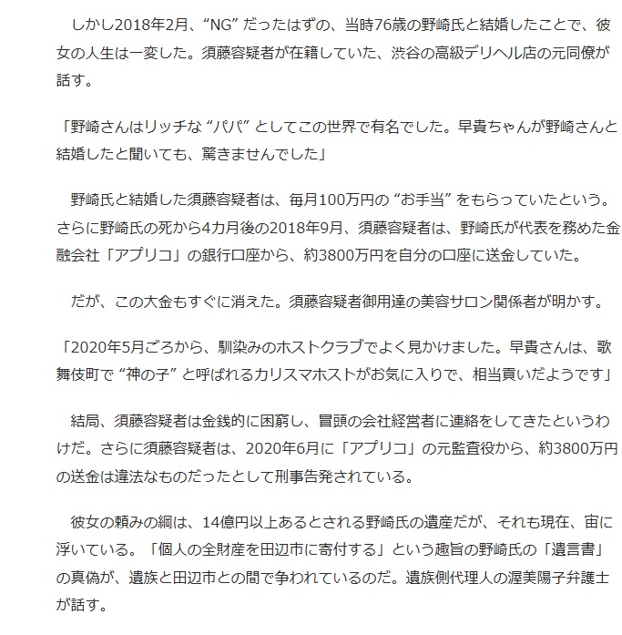 紀州のドン・ファンと呼ばれた野崎幸助さん(当時77)が急性覚醒剤中毒で死亡したことをめぐり、殺人罪などに問われた元妻の須藤早貴被告(30)について、大阪高検は、一審に続いて無罪とした大阪高裁判決を不服として、最高裁に上告