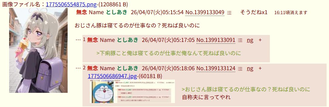 | … | 42無念Nameとしあき26/04/07(火)09:27:06No.1399150180+下痢豚は軽自動車のスレでも荒らして怒られた挙句「お前のせいだ!」ってやってた |