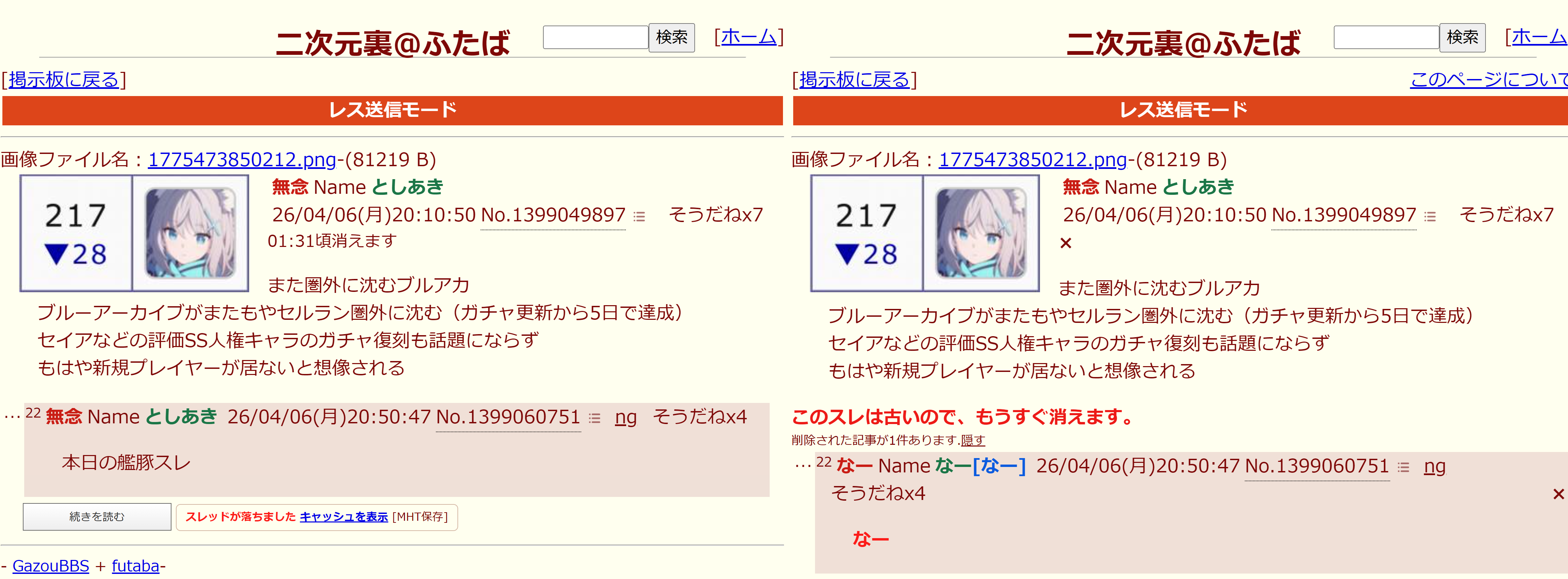 | … | 274無念Nameとしあき26/04/07(火)16:11:08No.1399209673そうだねx3>ブルアカは今も悲惨なのに上層部があんなだしな… |