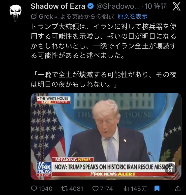 | … | 961無念Nameとしあき26/04/07(火)18:54:18No.1399239166+>>結局一番危険なのはアメリカなのを |