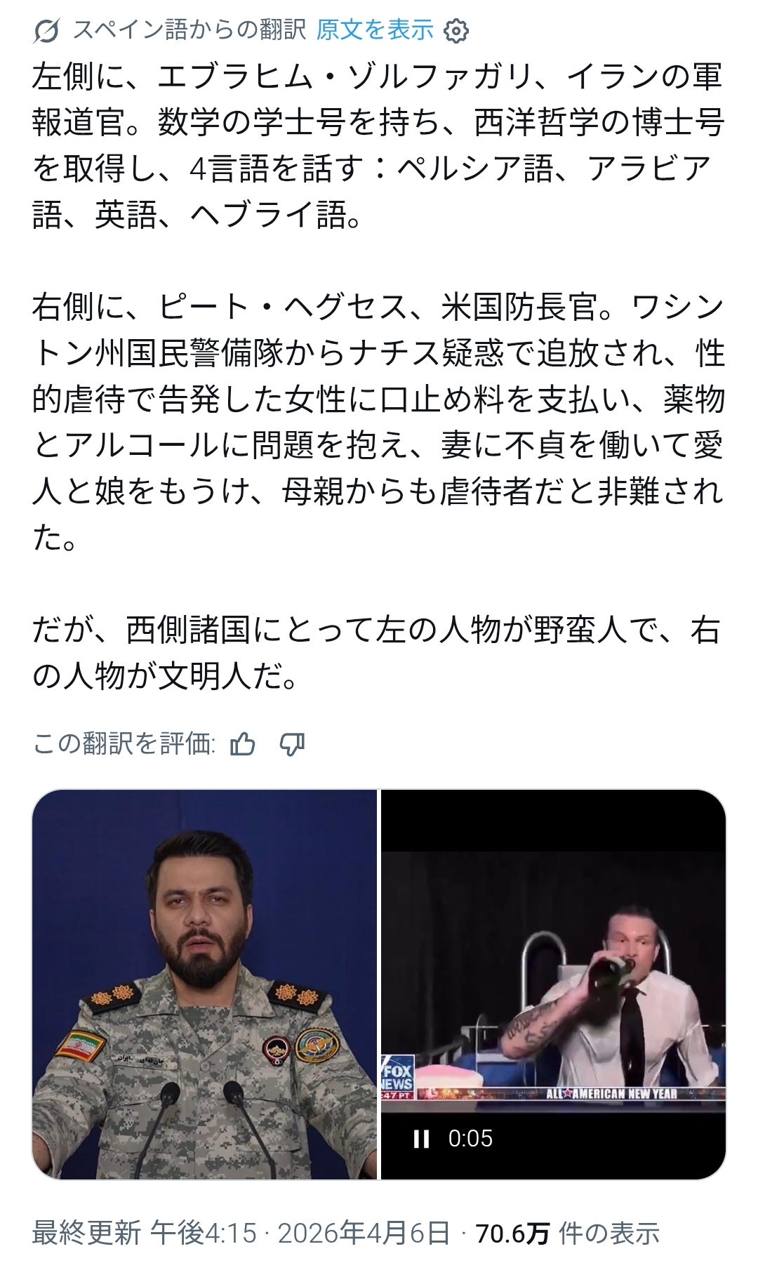 | … | 50無念Nameとしあき26/04/07(火)16:53:00No.1399215950+イランはイランでアメリカと仲の良い国を石器時代に戻してやるとか結局核持ってる自白してるのがなんとも |