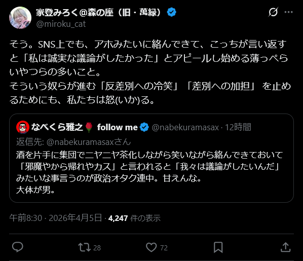 | … | 442無念Nameとしあき26/04/07(火)22:12:05No.1399293994+>所謂ネトウヨと話をしようとしない奴らが |