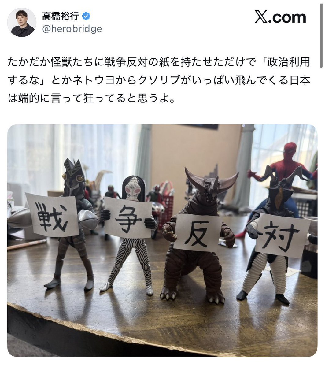 | … | 60無念Nameとしあき26/04/07(火)20:57:54No.1399273803+こいつただひたすらフィギュアに戦争反対のプラカード並べてるだけだけど飽きないのか? |