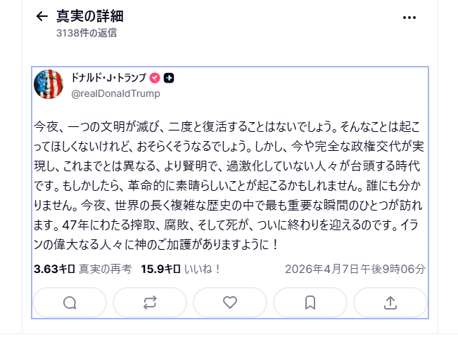 | … | 985無念Nameとしあき26/04/07(火)23:07:53No.1399307910そうだねx3トランプは核抜きでも暗君として歴史に残るだろ |
