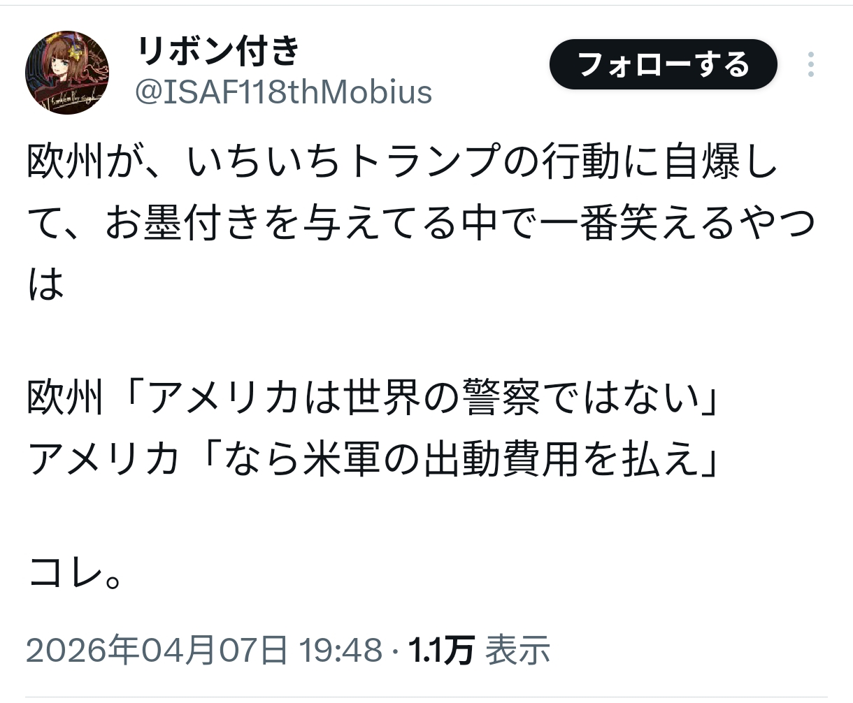 | … | 918無念Nameとしあき26/04/07(火)23:03:38No.1399306834+>誰も表立ってトランプに反対してない |
