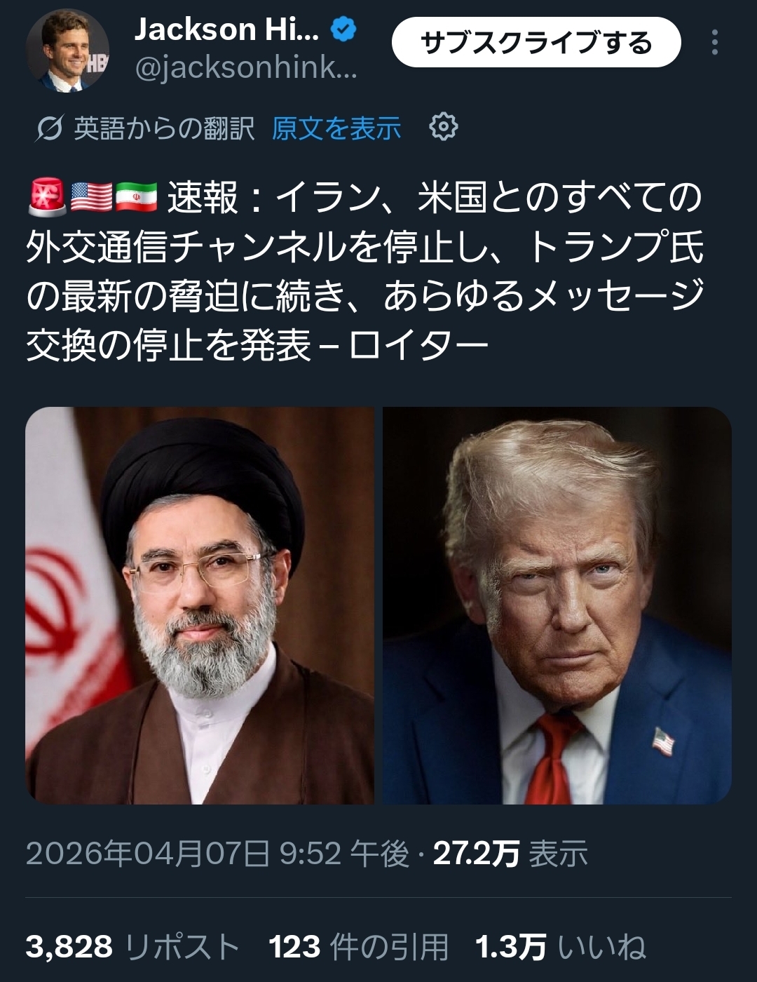 | … | 965無念Nameとしあき26/04/07(火)23:06:28No.1399307549+イランが変な意地を張るからこういう結果になる |