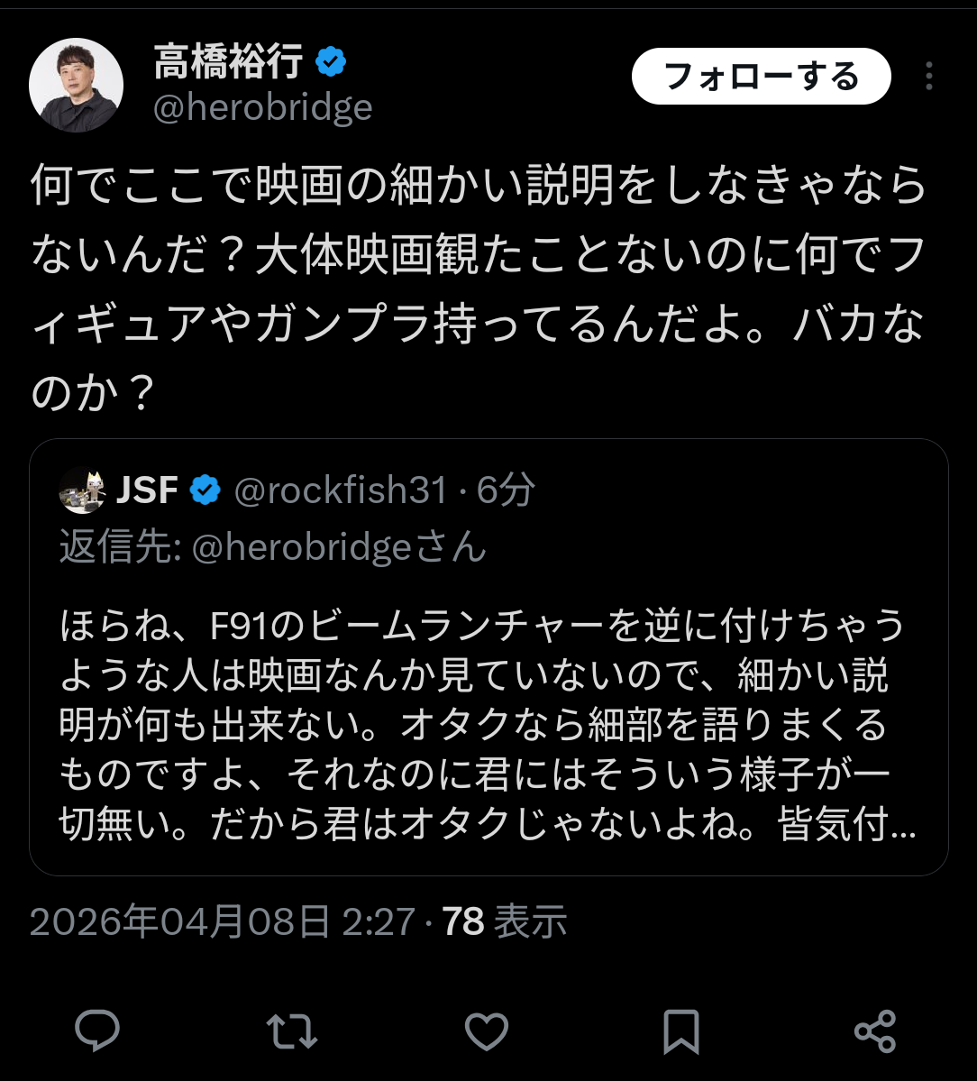 | … | 3無念Nameとしあき26/04/08(水)02:38:13No.1399339810+ 1775583493871.jpg-(46697 B) >何でここで映画の細かい説明をしなきゃならないんだ?大体映画観たことないのに何でフィギュアやガンプラ持ってるんだよ。バカなのか? |