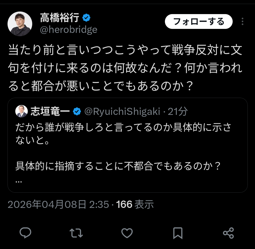 | … | 20無念Nameとしあき26/04/08(水)03:04:11No.1399341165そうだねx1オタクを名乗り戦争反対を堂々と口にする人間がこの体たらく |