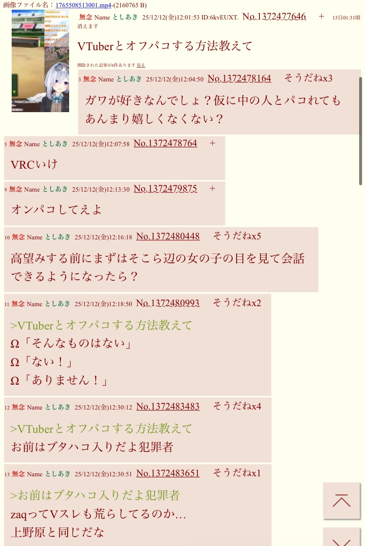 | … | 27無念Nameとしあき26/04/08(水)04:46:41No.1399344220そうだねx4 1775591201329.jpg-(12697 B) >女Vと会いたい |