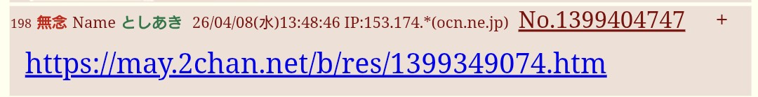 | … | 314無念Nameとしあき26/04/08(水)14:34:25No.1399411824+>ちなみに虹裏でのオナニー配信行為は社会貢献ではないからね |