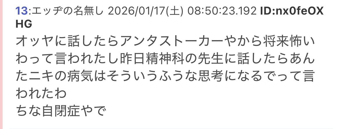 | … | 332無念Nameとしあき26/04/08(水)14:55:10No.1399414888+>頭の悪い方のASDは相手との距離感がわからない |