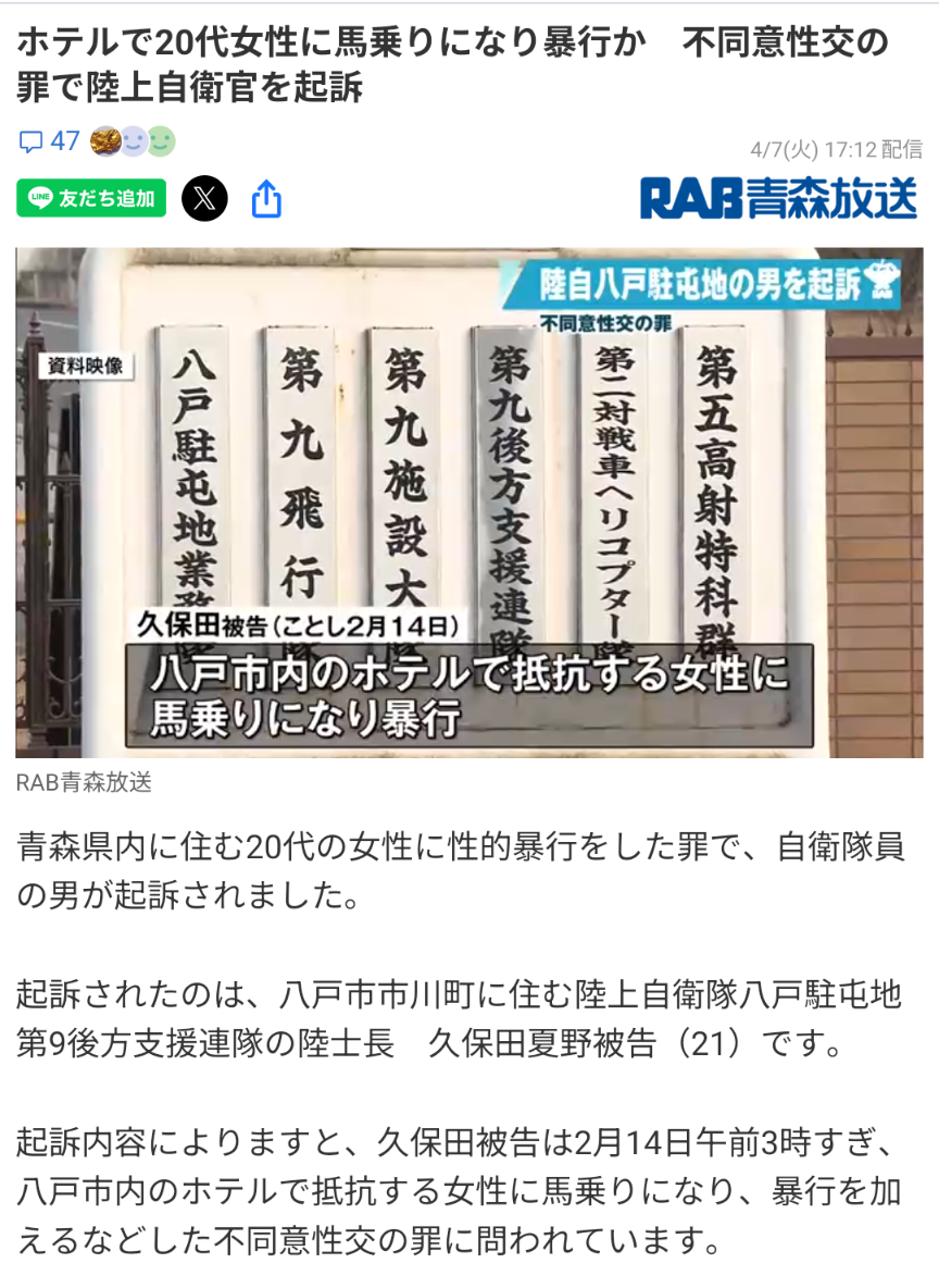 | … | 49無念Nameとしあき26/04/08(水)13:21:17No.1399400731+>>陸上自衛官、ホテルで20代女性に馬乗りになり暴行 |