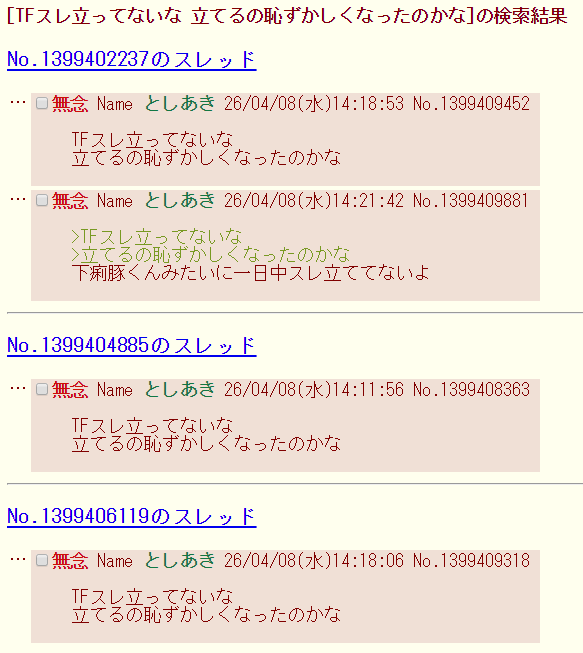 | … | 77無念Nameとしあき26/04/08(水)15:15:33No.1399418175+TFスレがふたばを荒らしてるらしいな |