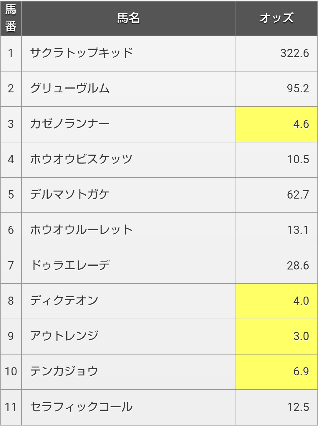 | … | 35無念Nameとしあき26/04/08(水)19:26:37No.1399464321+>中央からの落ち武者二頭(8番と11番)がふつうに人気になってるあたり |