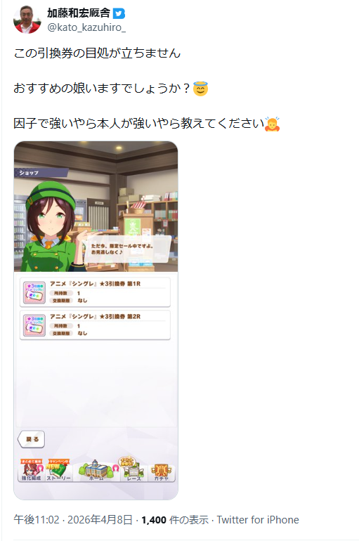 | … | 975無念Nameとしあき26/04/08(水)23:14:11No.1399527231+グローバル版4月1日でもないのにメジロ賛歌追加されて海外勢混乱してるみたいだな |