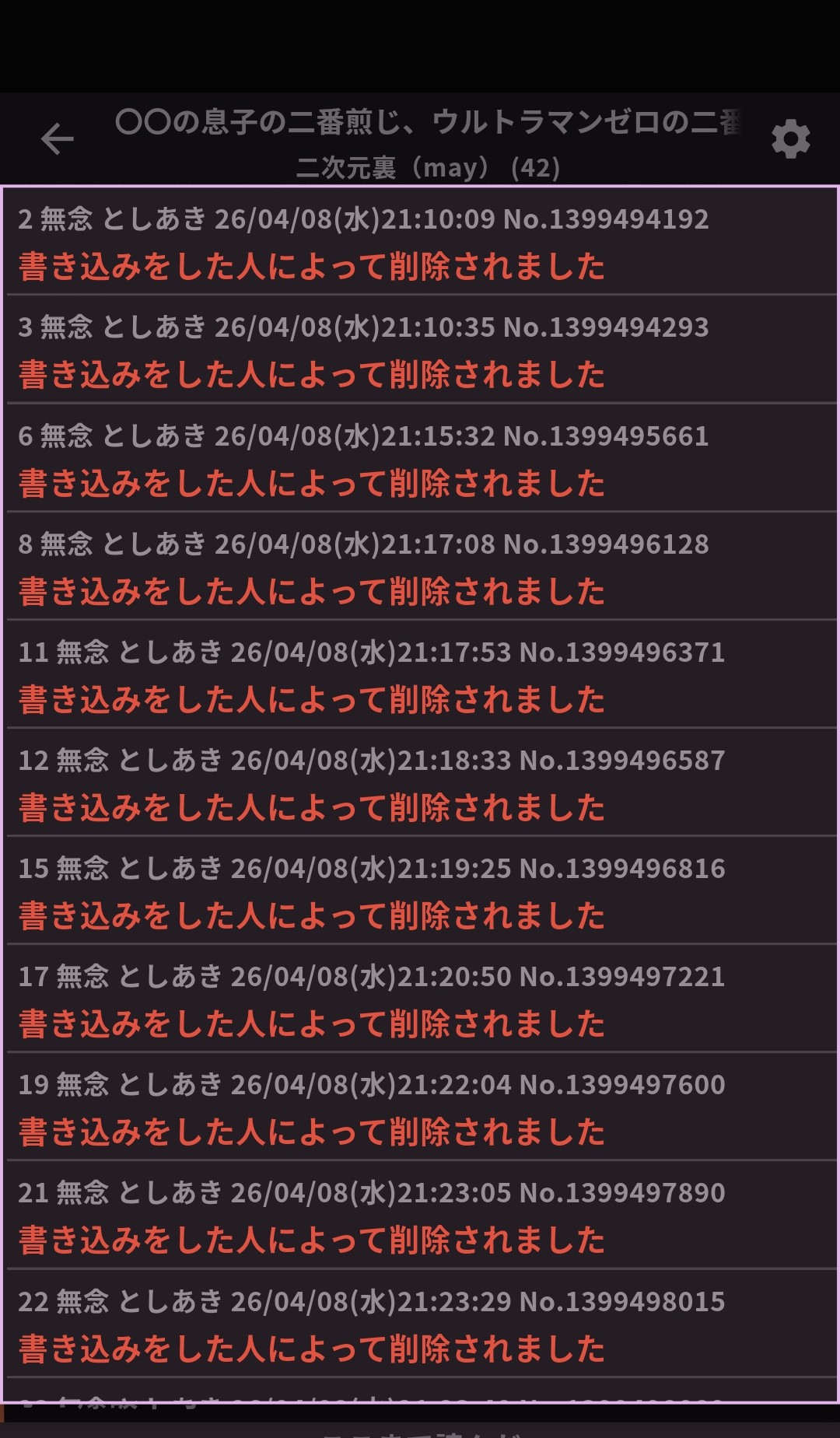 | … | 3無念Nameとしあき26/04/08(水)21:10:35No.1399494293+書き込みをした人によって削除されました |