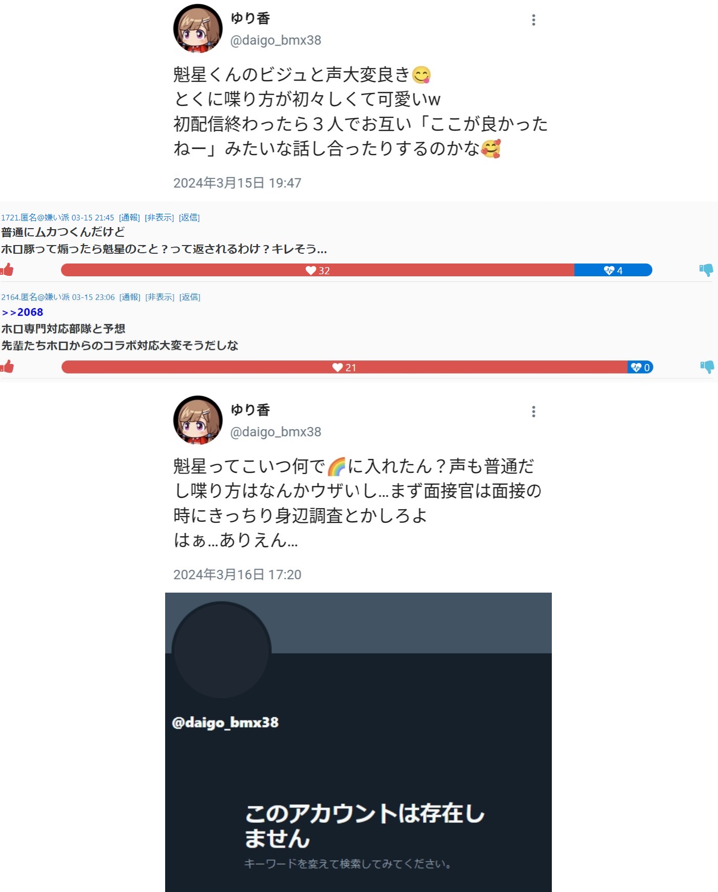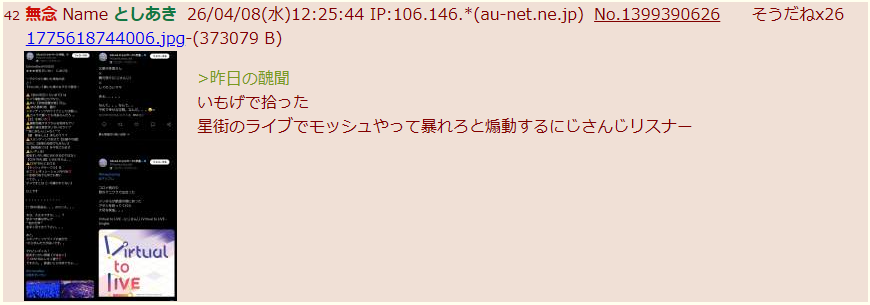 | … | 24無念Nameとしあき26/04/08(水)21:46:43No.1399504614そうだねx5 1775652403385.jpg-(39162 B) >ホロメンに叱られてるのに自覚のないホロ豚 |