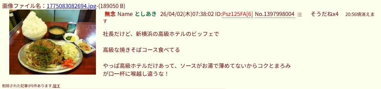 | … | 173無念Nameとしあき26/04/08(水)23:29:20No.1399530593+ 1775658560924.jpg-(55381 B) >社長だが? |
