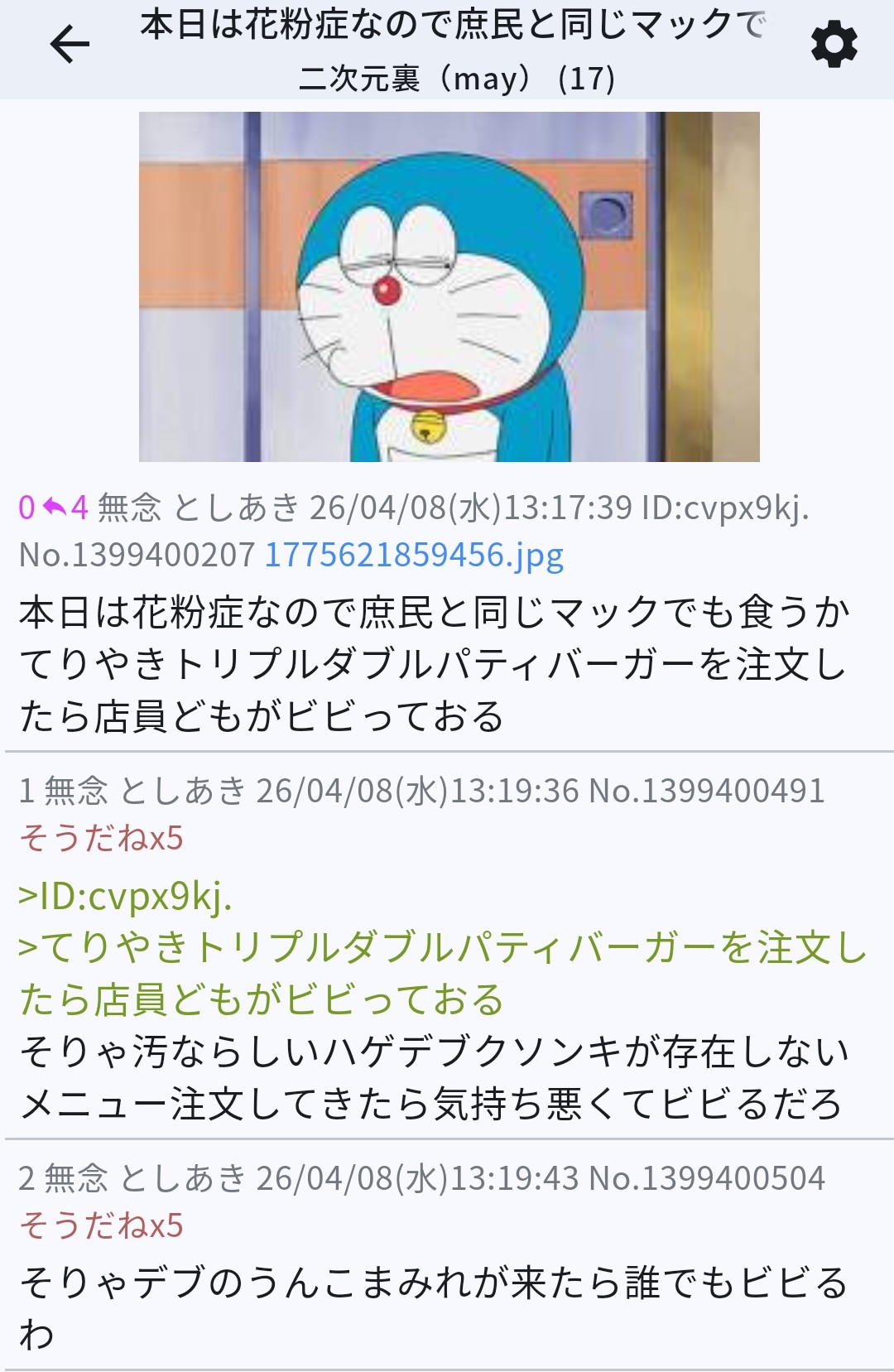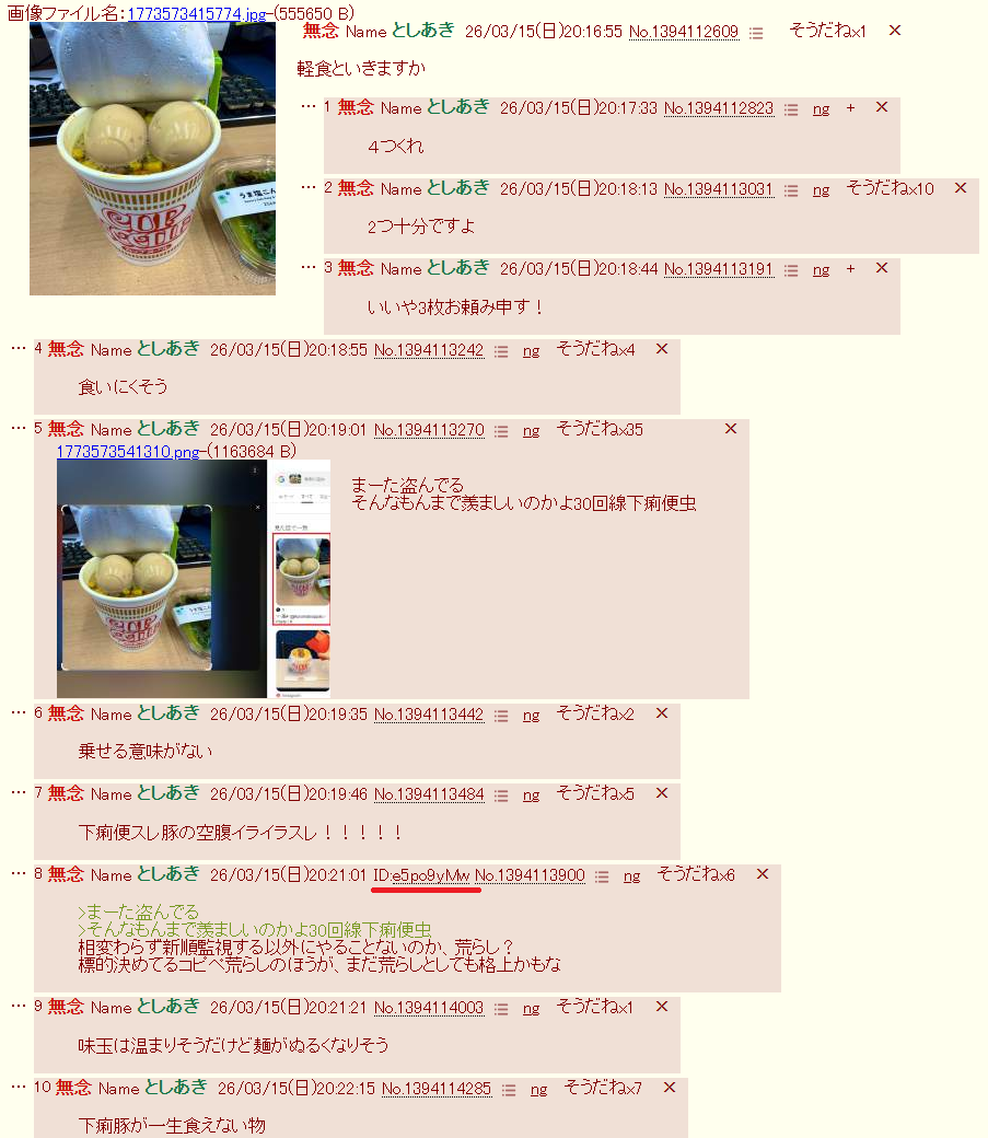 | … | 174無念Nameとしあき26/04/09(木)01:11:36No.1399548463そうだねx2日付とマヨネーズ間違えるレベルのメクラとか… |