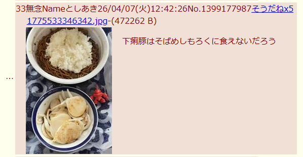 | … | 159無念Nameとしあき26/04/09(木)01:03:46No.1399547498+>やっぱ今後も飯の写真貼る時はちゃんと対策しとかないとダメだな |