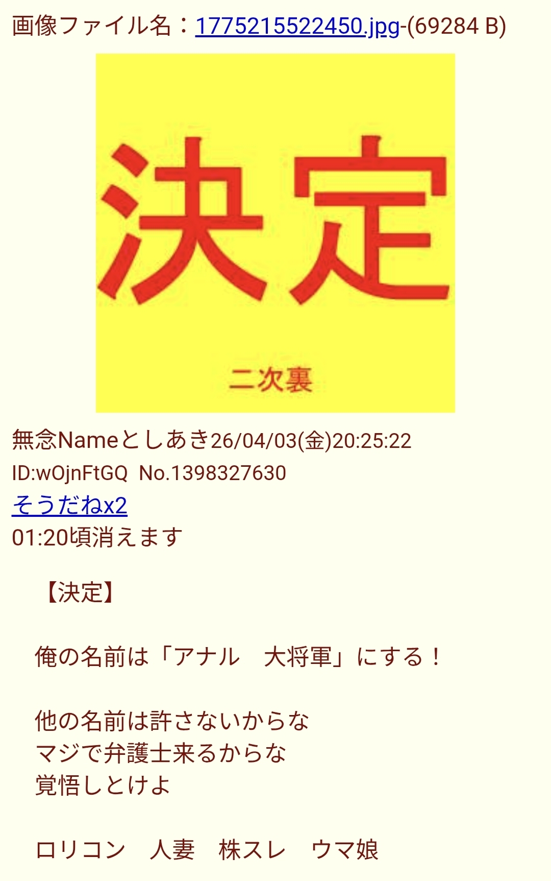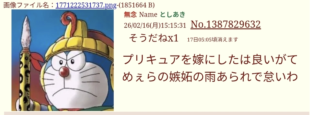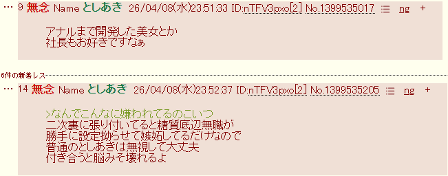 | … | 49無念Nameとしあき26/04/09(木)00:14:20No.1399539538そうだねx5>ID:nTFV3pxo |