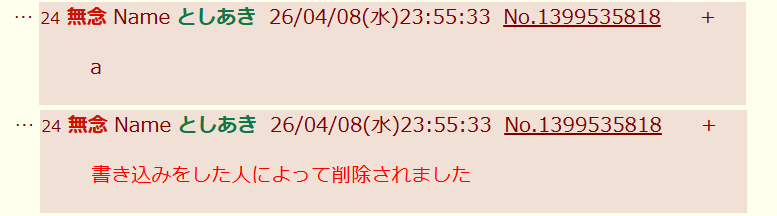 | … | 24無念Nameとしあき26/04/08(水)23:55:33No.1399535818+書き込みをした人によって削除されました |