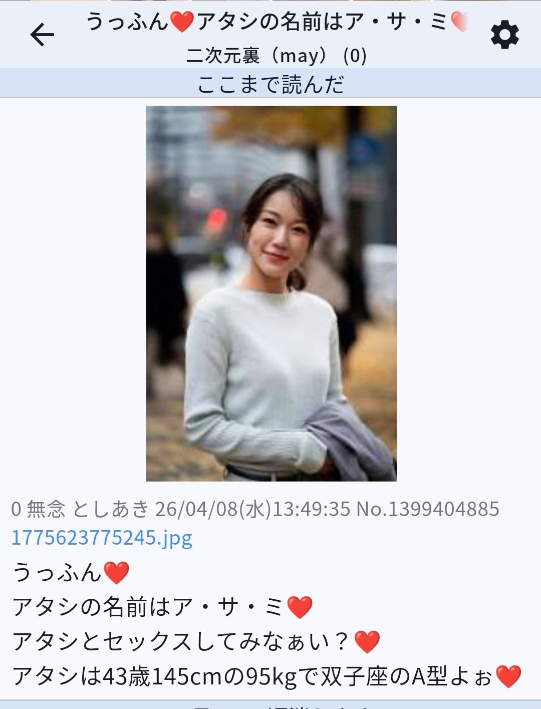 | … | 90無念Nameとしあき26/04/09(木)00:46:04No.1399545126そうだねx1>これもそうだけど見える人たちってどうやって相手の身長・体重・年齢を設定してるんや? |