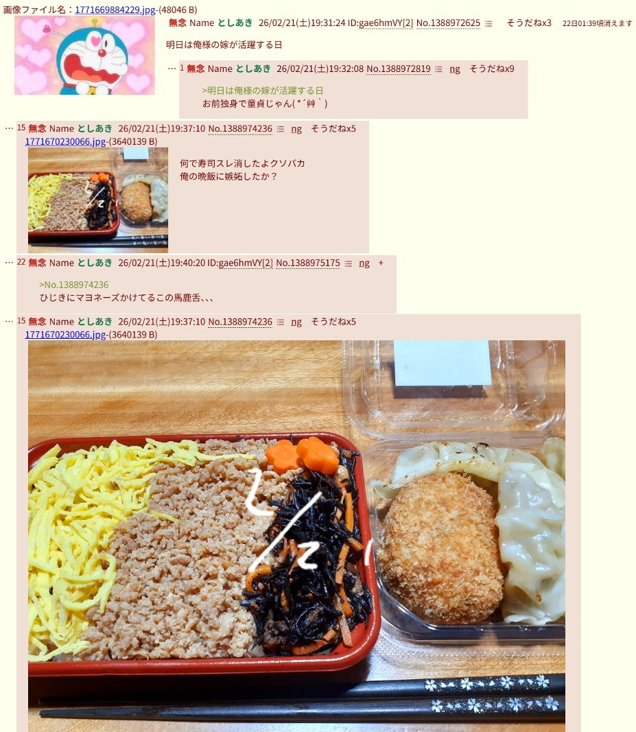 | … | 45無念Nameとしあき26/04/09(木)00:10:51No.1399538856そうだねx6弁当戦争とかいうガキ以下の遊びをやってるスレ豚にそっくりそのまま返すわw |
