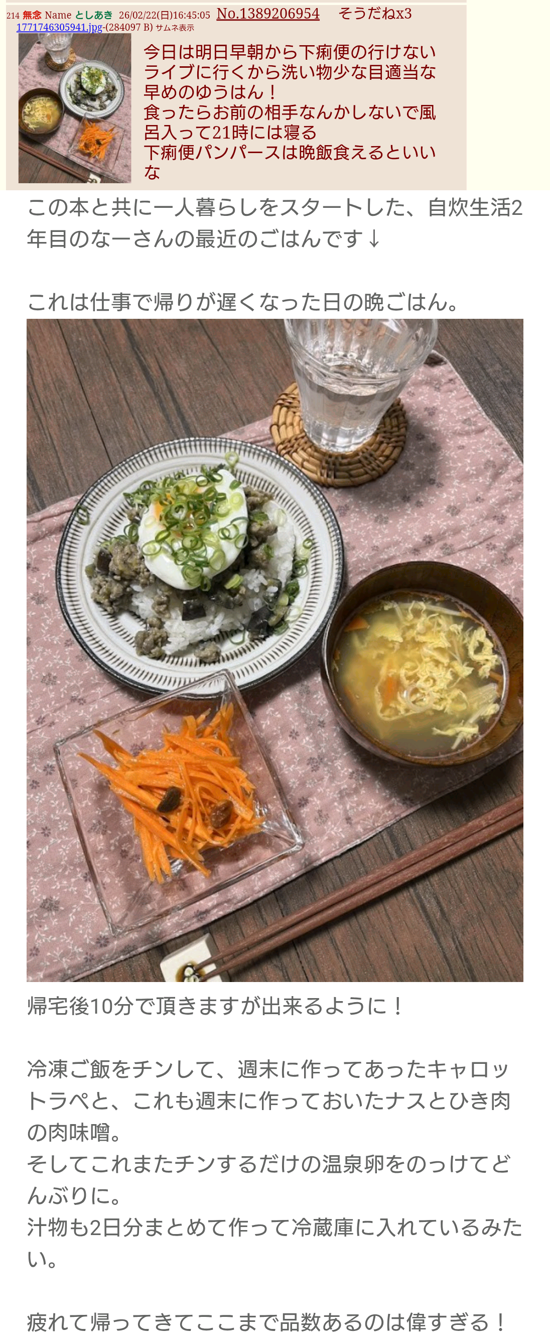 | … | 19無念Nameとしあき26/04/08(水)23:54:11No.1399535532そうだねx6こんなメシ画像貼られて嫉妬してんのか禁治産者は |