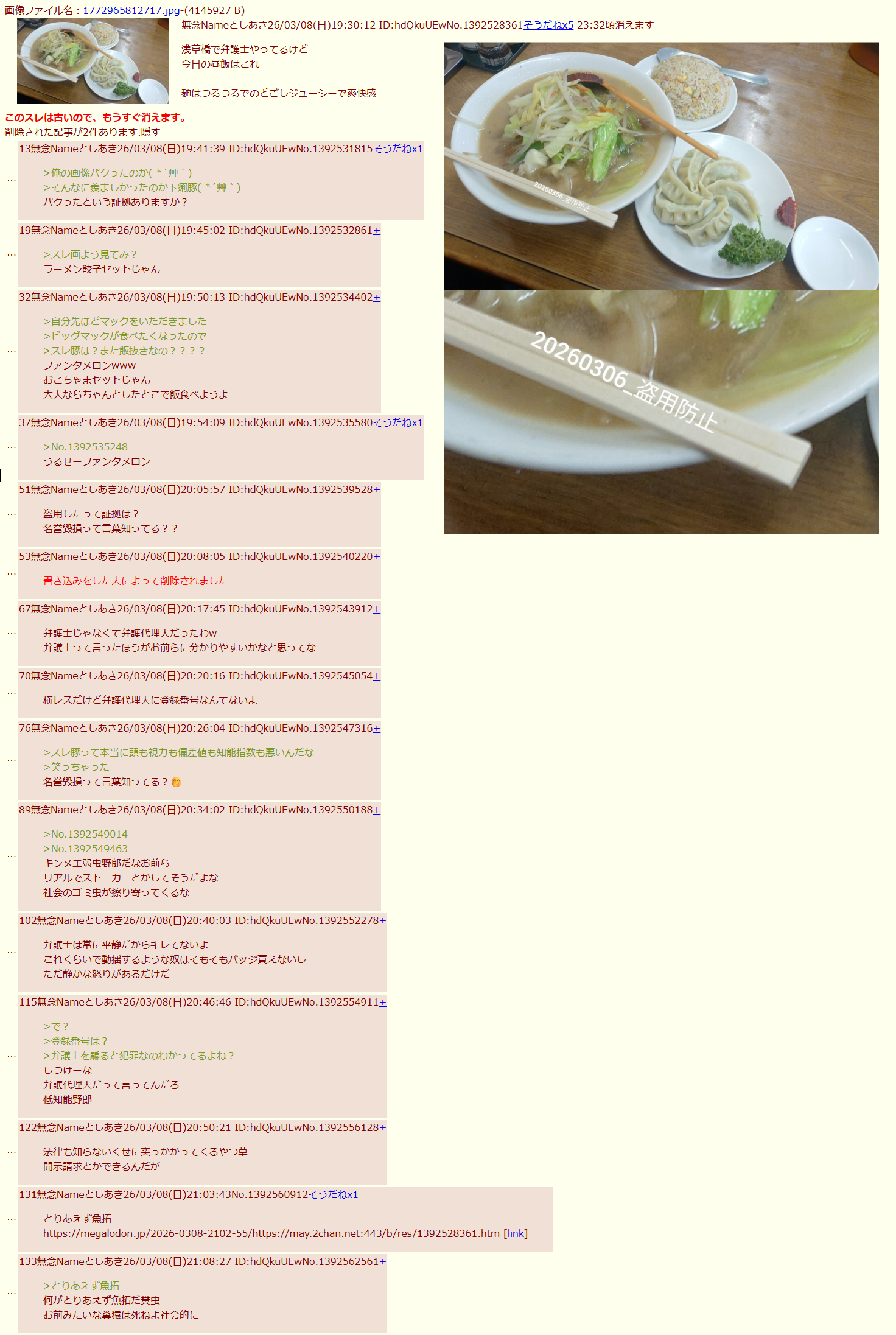 | … | 158無念Nameとしあき26/04/09(木)01:03:42No.1399547491+>やっぱ今後も飯の写真貼る時はちゃんと対策しとかないとダメだな |