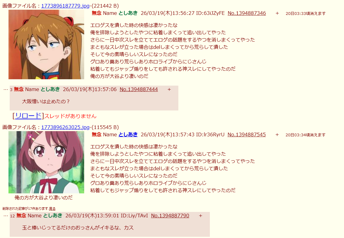 | … | 185無念Nameとしあき26/04/09(木)01:16:27No.1399549022+>自分で荒らして自分で撮ったスクショ貼り付けるの楽しい? |