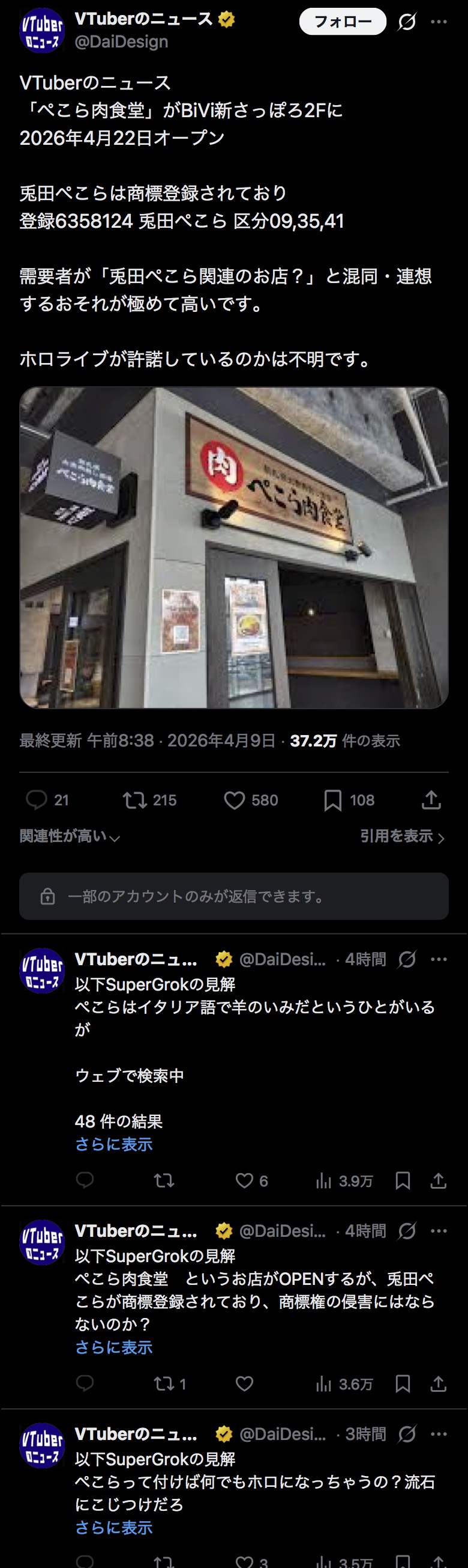 | … | 39無念Nameとしあき26/04/09(木)15:51:21 IP:126.156.*(openmobile.ne.jp)No.1399634254+そしてまたぺこらの商標どうのこうのを真に受けたGrokがトレンドにして拡散する形になってるし |