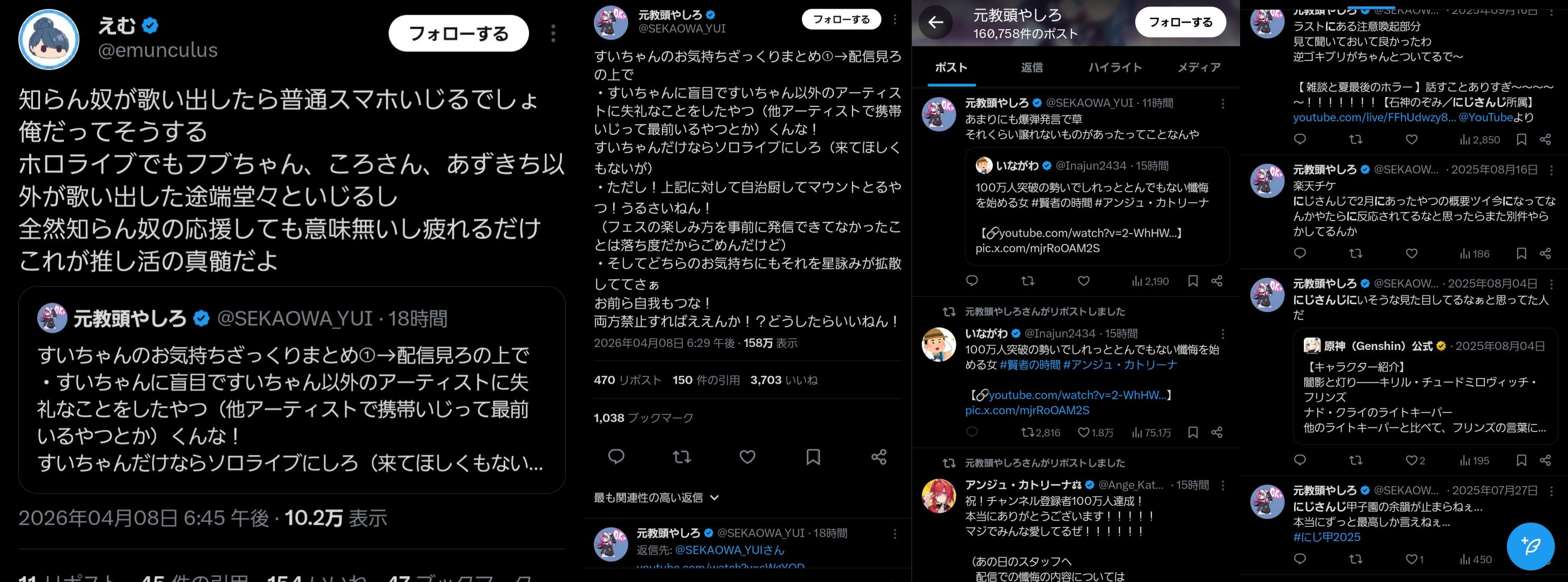 | … | 109無念Nameとしあき26/04/09(木)16:48:04 IP:14.133.*(commufa.jp)No.1399642291そうだねx1>エニカラのやり方って最初の数年でVtuberという分野を焼畑した上で絞り尽くしたらスパッとやめて次の稼ぎ方へ…って感じがするのに |
