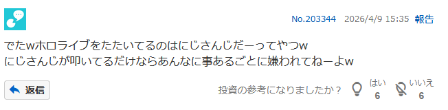 | … | 20無念Nameとしあき26/04/09(木)15:21:53 IP:126.35.*(panda-world.ne.jp)No.1399630294+>なんでにじリスって嫌いなホロメンの情報わざわざ見に行くの? |