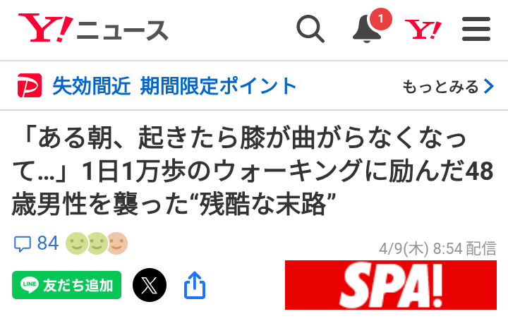 | … | 54無念Nameとしあき26/04/10(金)01:29:24No.1399755188+半月板割れたんで痛みに耐えながら毎日五千歩ウォーキングがんばってる |