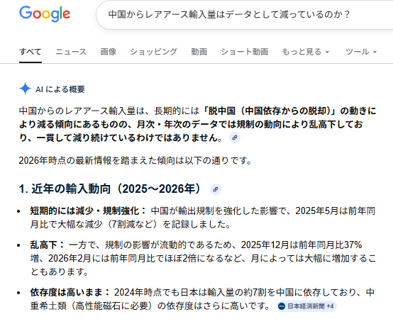 | … | 154無念Nameとしあき26/04/10(金)06:54:59No.1399768823+今更中国のレアアース批判しても今までそれを輸入してたのはどの日本だろうか |