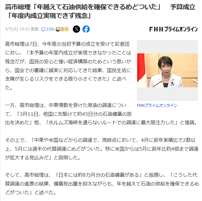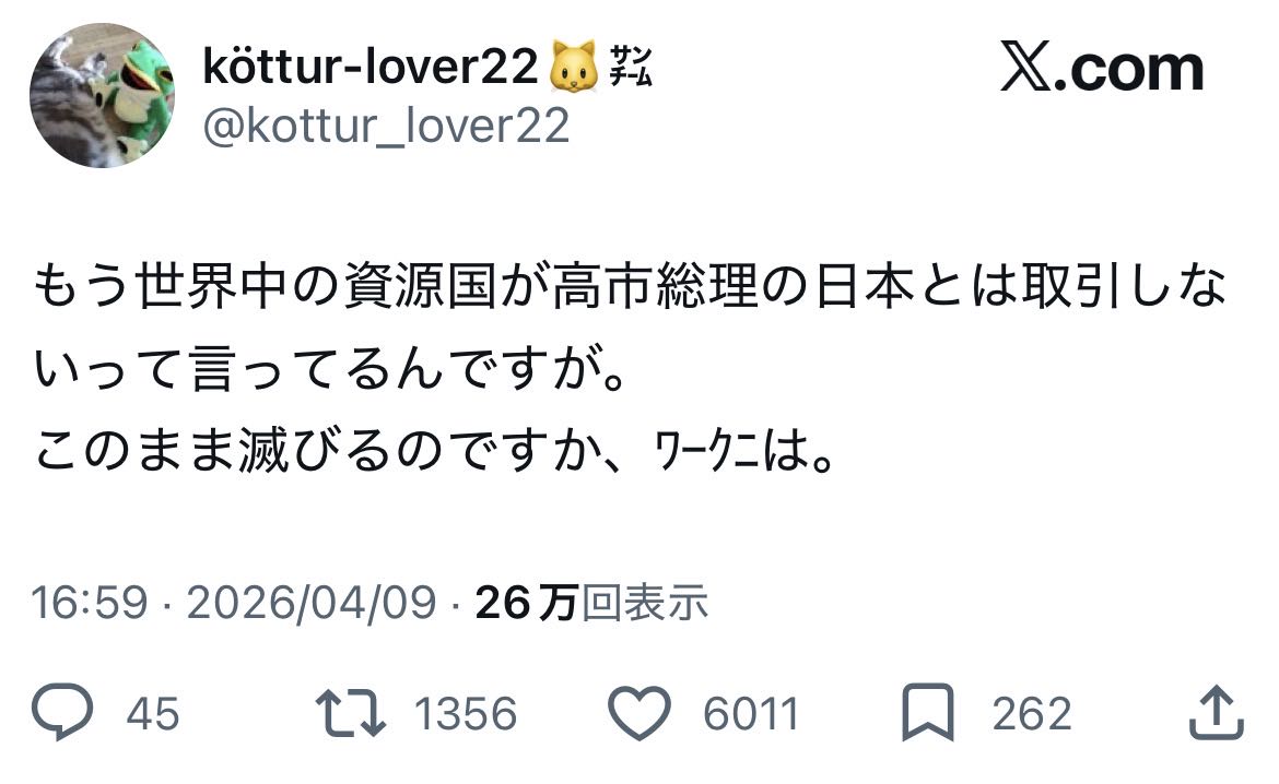 | … | 116無念Nameとしあき26/04/10(金)06:25:38No.1399767162そうだねx1>石油足りんようになるのに高市は何やってるんよ |