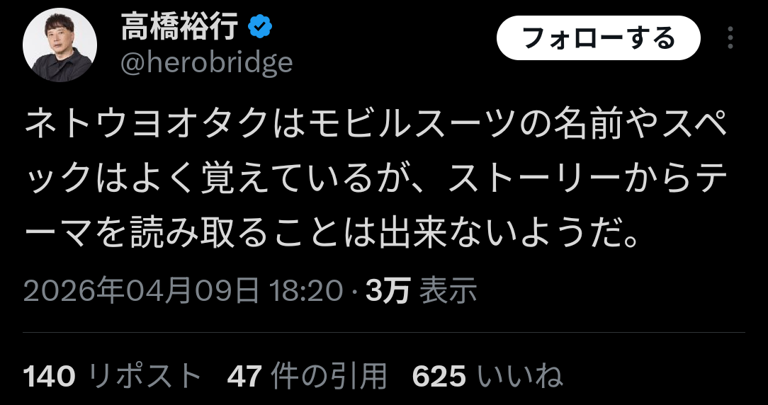 ネトウヨオタクはモビルスーツの名前やスペックはよく覚えているが、ストーリーからテーマを読み取ることは出来ないようだ。