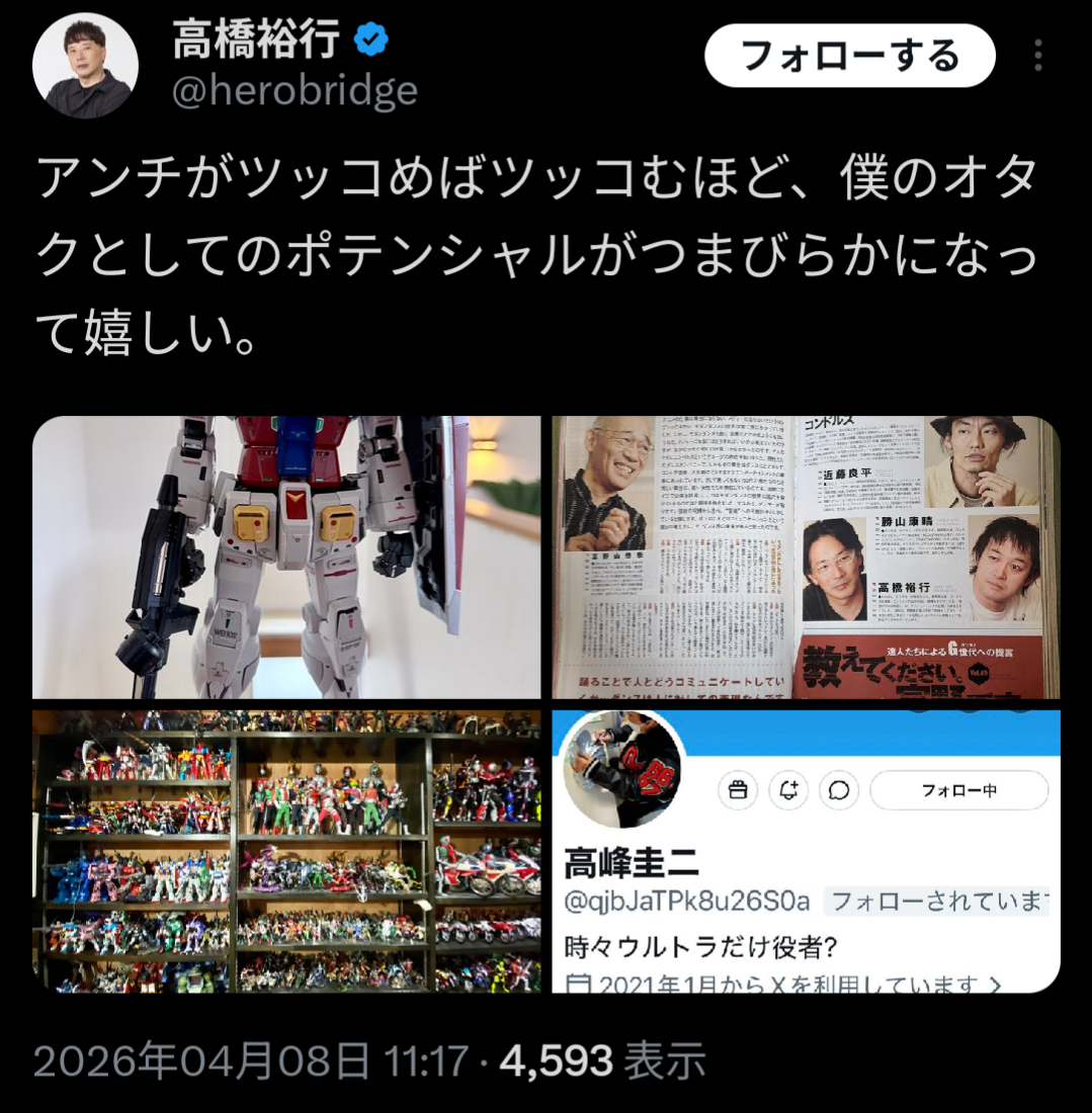 | … | 117無念Nameとしあき26/04/10(金)07:07:54No.1399769702そうだねx3こいつなんでこんなに恥晒してまで今まで自分が叩いてたオタクのフリしようとしてんの? |