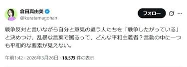 | … | 106無念Nameとしあき26/04/10(金)07:03:42No.1399769390そうだねx5>「戦争反対」と言ったら左翼扱いされるなら |