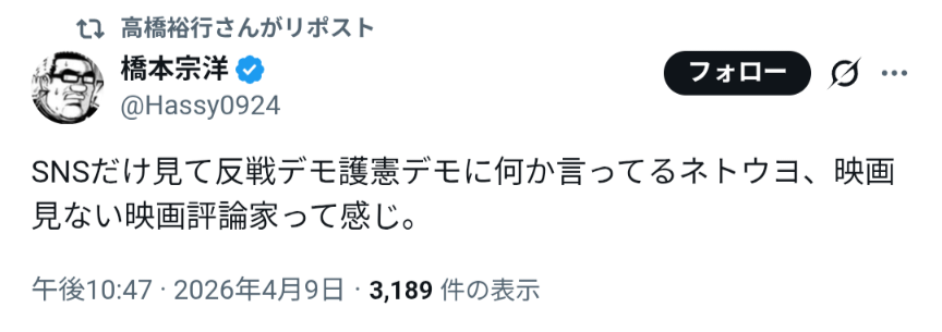 | … | 138無念Nameとしあき26/04/10(金)07:21:44No.1399770711+>映画見ない映画評論家はネトウヨ |