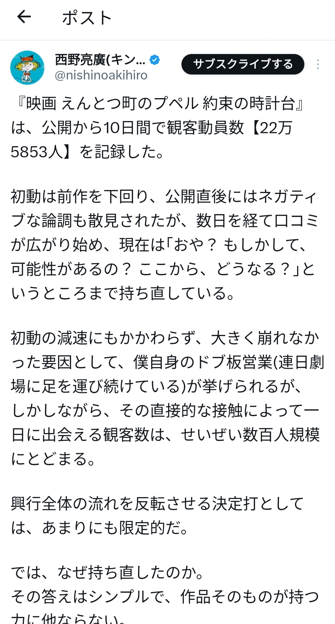 | … | 516無念Nameとしあき26/04/10(金)13:15:26No.1399815301+西野亮廣、映画『プペル』続編の「爆死」評価を一蹴! 毎日映画館を回る“地上戦”と『トトロ』化を狙う「超長期・逆転戦略」とは? |