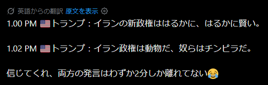 | … | 983無念Nameとしあき26/04/10(金)12:40:05No.1399808708+>俺のせいかよトランプ |