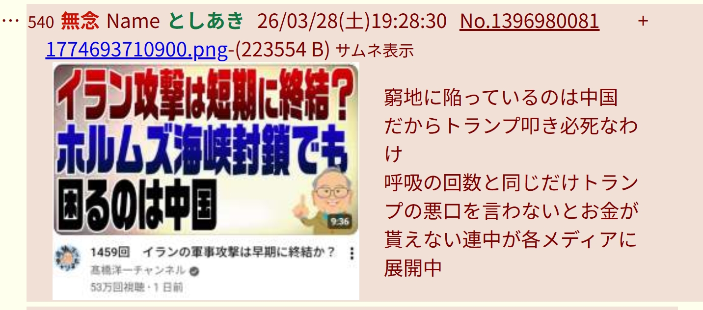 | … | 954無念Nameとしあき26/04/10(金)12:33:54No.1399807280+高市アンチはどこからのポジショントークなの? |