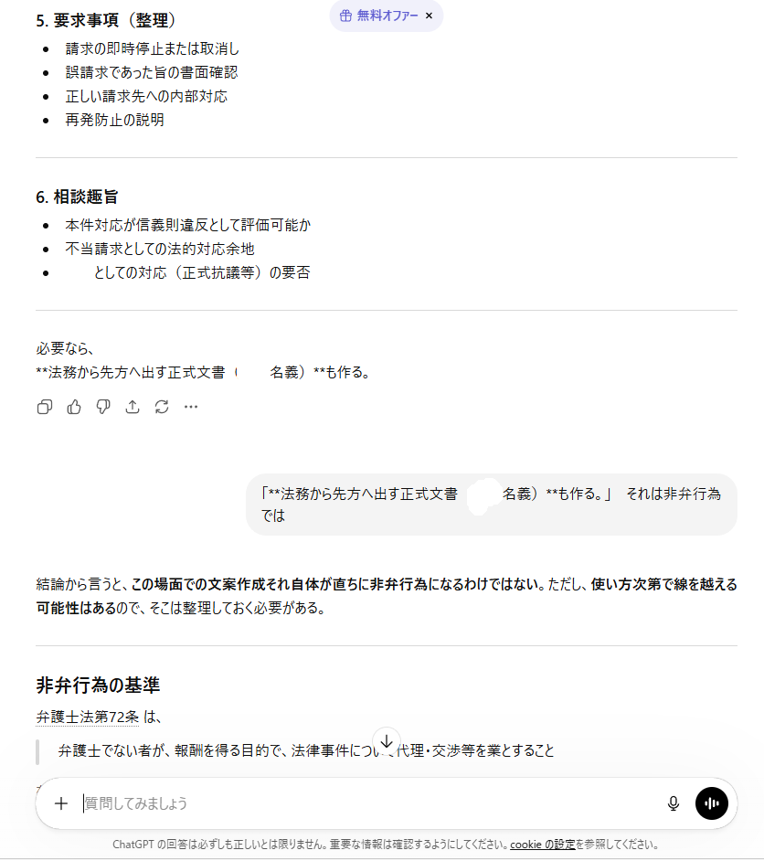 | … | 55無念Nameとしあき26/04/10(金)11:22:11No.1399795569+>非弁行為を薦めてくる違法AIチャットGPT |