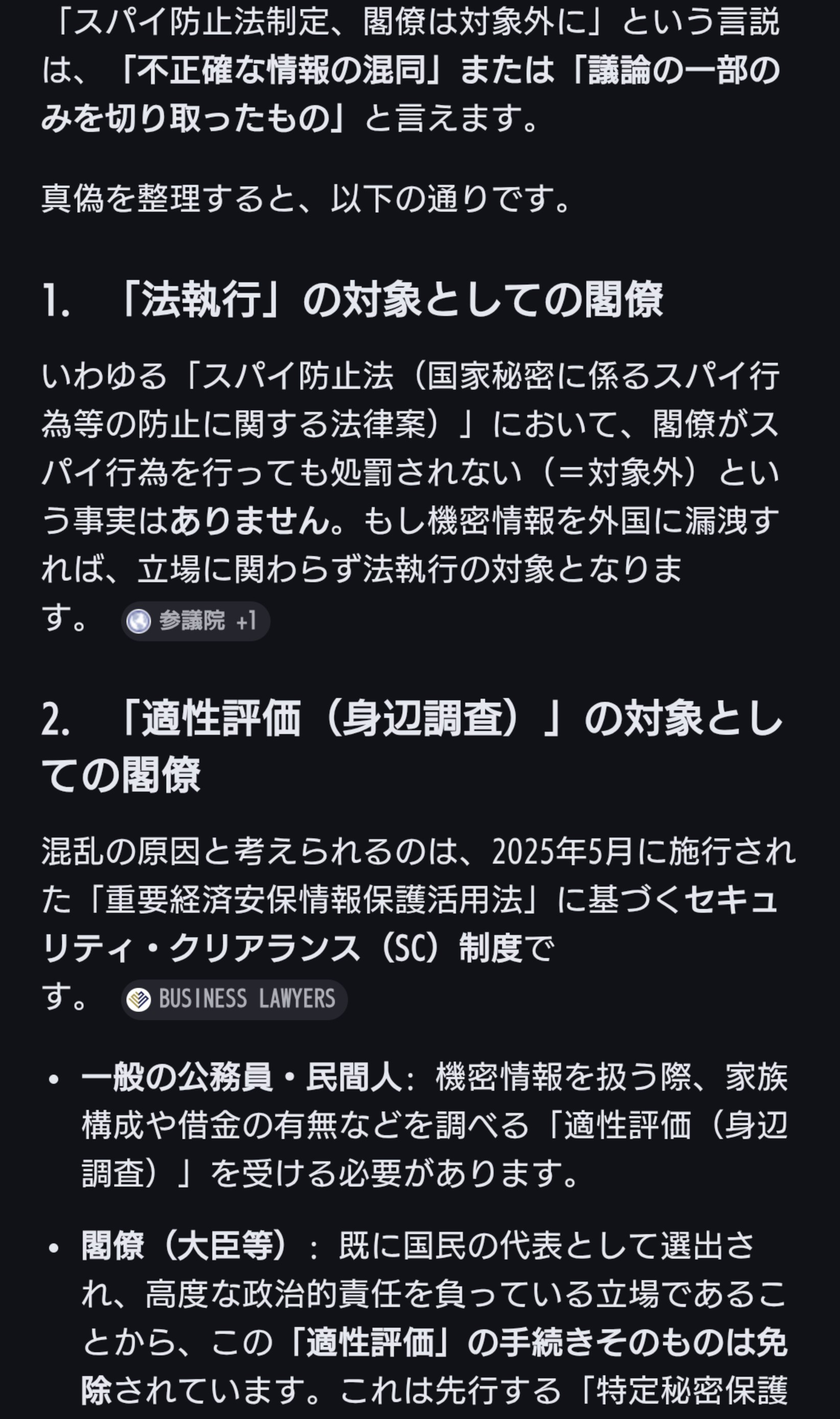 | … | 37無念Nameとしあき26/04/10(金)17:35:37No.1399856393+制定の動き: 自民党と日本維新の会は、2025年にスパイ防止法(基本法、外国代理人登録法など)の検討を開始し、速やかに法案を成立させる合意を形成している。 |